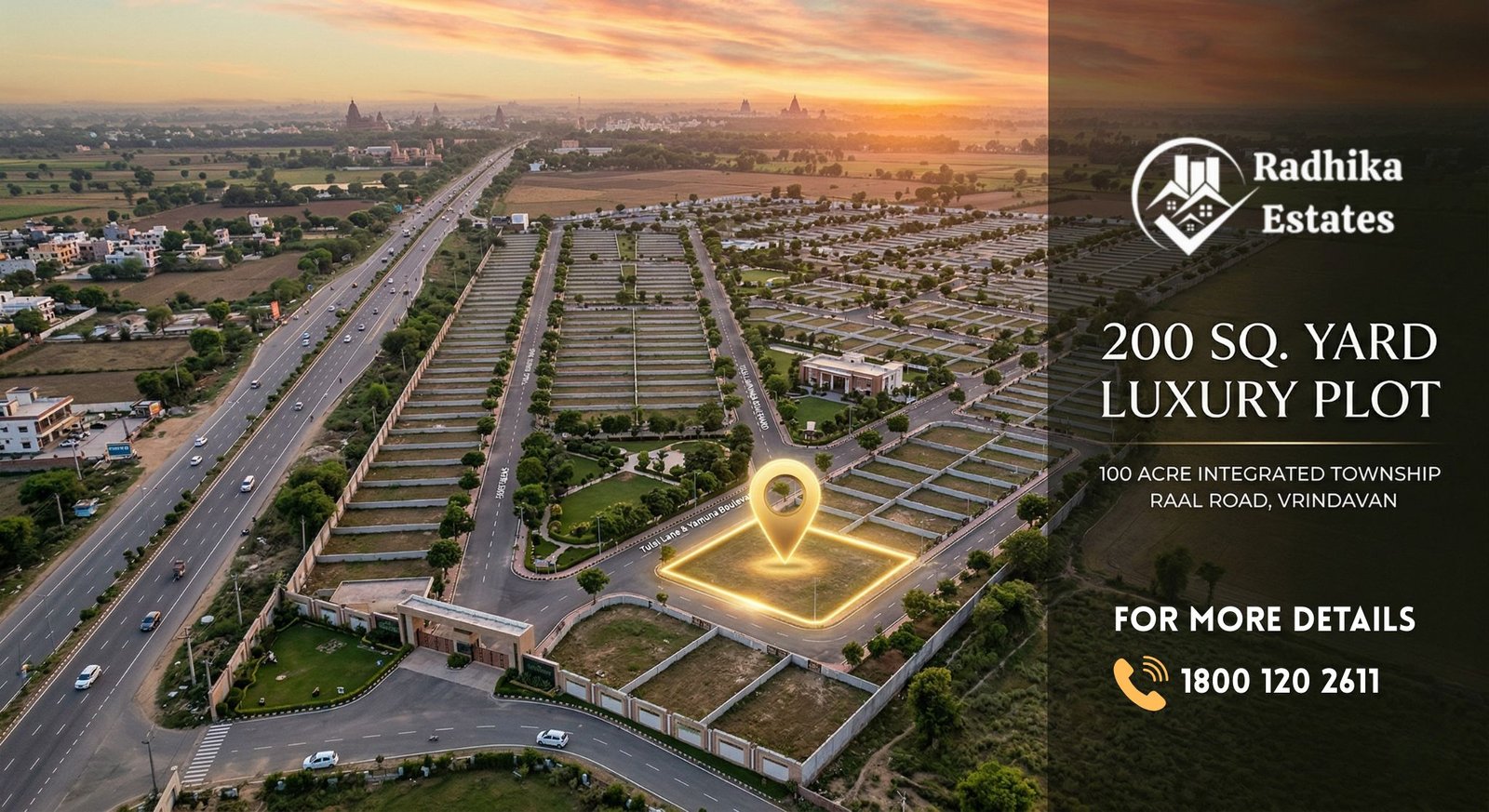 200 Sq Yard Plot in Raal Road Vrindavan is available for sale in the 100 Acre Integrated Township Vrindavan, a planned plotted development located at Raal Road, which is one of the fastest growing real estate investment corridors in Vrindavan. This integrated township project is designed with planned infrastructure, wide internal roads, green areas, and township amenities, making it suitable for premium residential construction as well as long-term real estate investment in Vrindavan.