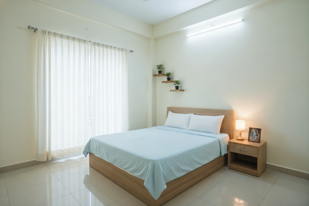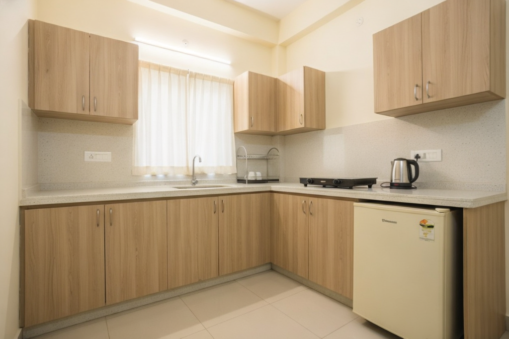 The apartment features modular furniture, air-conditioning, LED lighting, a comfortable bed, spacious wardrobes, and a well-equipped kitchenette, allowing you to move in effortlessly. The attached balcony opens to serene green surroundings, letting you enjoy Vrindavan’s divine tranquility every day.
